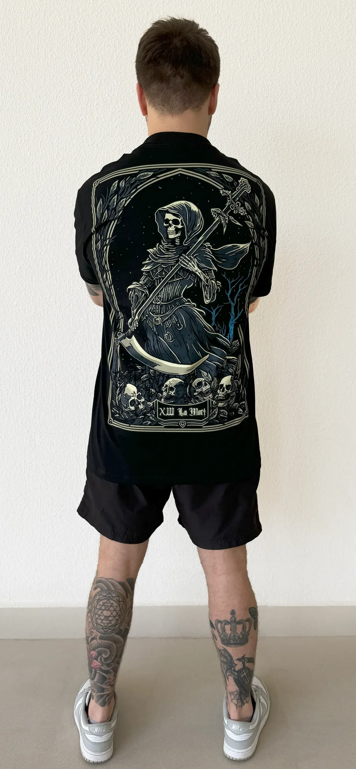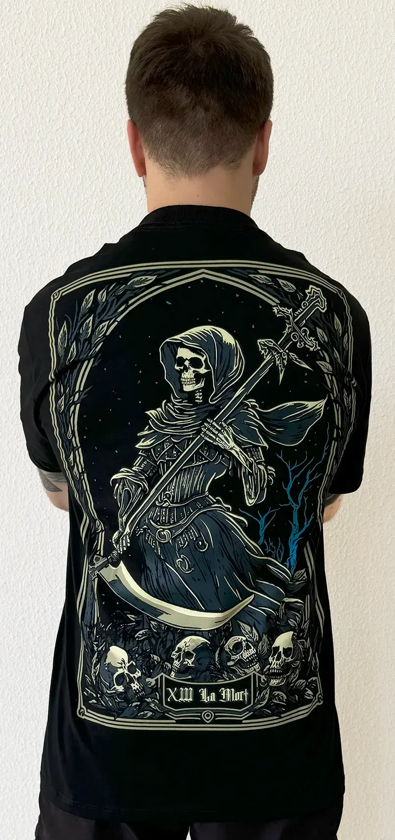 Ao fundo, árvores estendem seus galhos secos, desfolhadas e dobradas, observam os incontáveis destinos encerrados, destacando-se contra um céu pontilhado por estrelas distantes. Na base, crânios repousam entrelaçados com ramos, testemunhas da eterna que a todos engole.