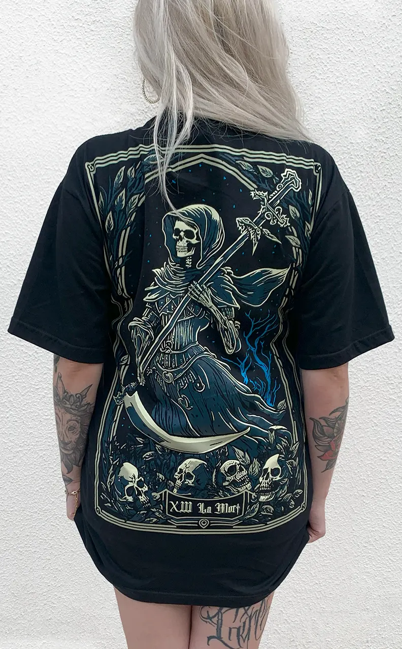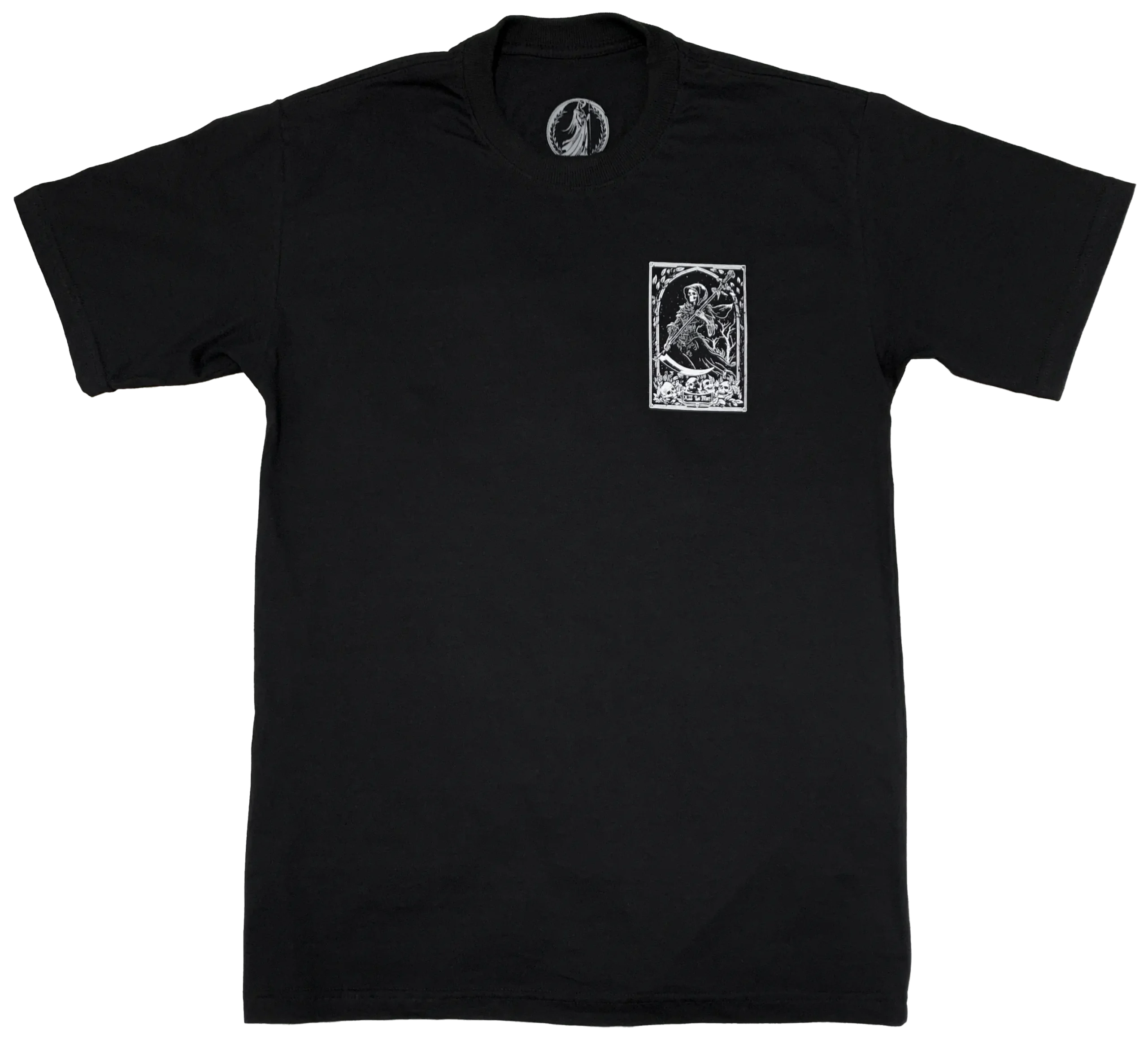 A Morte se revela, vestida em um manto escuro. O rosto vazio e sem expressão, espreita debaixo do capuz. Em suas mãos, segura uma foice adornada, lâmina que corta até os fios mais densos da vida.